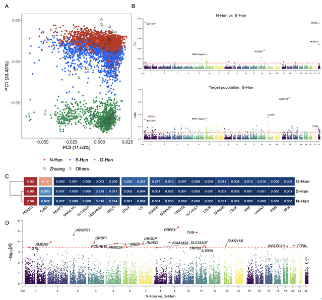 该研究还揭示了汉族群体内部存在显著遗传分层。广西汉族在遗传结构上更接近壮族,特定变异如GJB2基因rs72474224-A(与听力损失相关)和HBB基因变异(与β-地中海贫血相关)在广西汉族和壮族中频率最高。地域适应性选择进一步塑造了南北方遗传差异:MTHFR rs1801133-A(叶酸代谢)在北方频率较高,而ALDH2 rs671-A(酒精代谢)在南方频率较高,可能与水稻种植区的饮酒传统相关;ABCC11 rs17822931-A(热带适应)在广西汉族中的频率显著区别于其他汉族亚群。此外,南方汉族在视网膜色素变性(PRPF4、TUB)相关基因上的罕见有害突变负荷显著高于北方汉族,提示疾病风险存在地理分层。