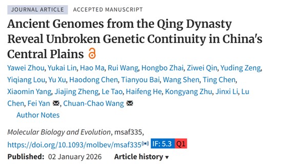 2026年1月2日,复旦大学王传超教授团队联合三门峡市仰韶文化研究中心、郑州大学考古与文化遗产学院在国际期刊《Molecular Biology and Evolution》发表题为“Ancient Genomes from the Qing Dynasty Reveal Unbroken Genetic Continuity in China's Central Plains”的研究论文。研究团队通过对河南三门峡三职院遗址46具清代人骨开展古基因组深度分析,从遗传学视角填补了中原地区晚近历史时期人群演化研究的空白。研究显示,尽管历经明清政权更迭、大规模移民及多民族文化互动,中原人群的遗传结构仍保持惊人稳定性与连续性,延续了数千年来未中断的黄河农业人群遗传脉络。
