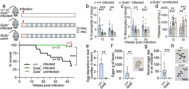 为验证该假设,研究团队构建了GULO基因敲除小鼠模型,该类小鼠与人类相似,无法自主合成维生素C。通过饮食调控实施“有限维生素C剥夺”(间歇性补充维生素C以避免坏血病),研究人员发现,该干预能几乎完全预防血吸虫病相关的肝脏病理损伤,并有效抑制虫卵的排出与传播。